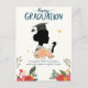 A vertical card design with a white background. At the top, the words "happy GRADUATION" are written in a mix of cursive and bold fonts. The central image is a silhouette of a female graduate with her hair in a bun, wearing a cap and holding a diploma. A bouquet of large, pink-orange flowers is placed below her neck, and abstract gold stars are scattered around the top. The bottom features a quote: ""Incredible work! The world is waiting for you to do great things."" A colorful, detailed floral border is at the very bottom.