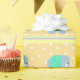 A cute design featuring blue Indian elephants wearing colorful blankets on their backs. Soft colored stripes on a polka dot background.