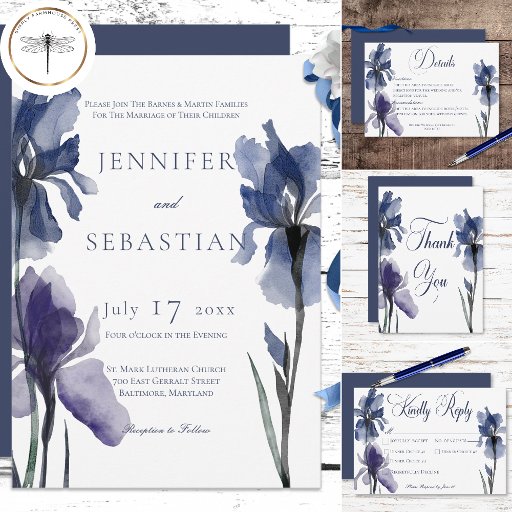Immerse your guests in timeless elegance with our captivating wedding save the date card. Deep navy blue irises, painted in a semi-transparent watercolor wash, gracefully frame your text on both sides, adding a touch of sophisticated charm. The ethereal blooms stand out beautifully against the blue watercolor wash background, creating a sense of effortless beauty. The back of the cards continues the blue watercolor wash, echoing the floral motif and adding a touch of modern luxury. This enchanting suite promises to leave a lasting impression, perfectly reflecting the refined romance of your wedding day. Created by Simply Farmhouse Press.