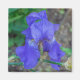 A close up photograph of a beautiful blue iris flower printed on a square fridge magnet.