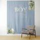 It's a boy baby shower photo booth backdrop featuring elegant typography and pretty botanical greenery foliage on a dusty blue background. Designed by Thisisnotme©
