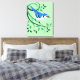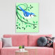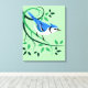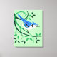 Decorative canvas bird art with customizable background color of Blue Jay perched on stylized branches and leaves