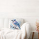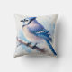 This throw pillow features a watercolor painting of a vibrant blue jay perched on a branch lightly dusted with snow. The bird's striking plumage includes shades of blue, soft lavender, and white. The background blends subtle splashes of blue, creating a dynamic yet serene atmosphere. Perfect for bird lovers!