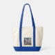 Love the durable cream colored canvas and navy blue contrasted handles. Perfect for carrying my laptop and papers.