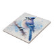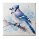 This ceramic tile features watercolor artwork of a vibrant blue jay perched gracefully on a delicate branch lightly dusted with snow. The bird's striking plumage, with shades of brilliant blue, soft lavender, and white, is highlighted by intricate details and soft brushwork. The background blends subtle splashes of blue and earthy tones, creating a dynamic yet serene atmosphere that complements the bird's natural beauty. Perfect for nature lovers and art enthusiasts, this watercolor painting captures the elegance and charm of one of nature's most iconic birds.