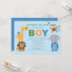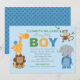 This colorful baby shower invitation features a playful stack of jungle animal friends — lion, giraffe, monkey, elephant, and hippo — surrounding bold "BOY" text in bright rainbow colors. The fun safari theme is perfect for a baby boy celebration, with blue, orange, green, and gray accents throughout. A coordinating blue polka dot backing completes the two-sided design. All wording is fully customizable for your event.