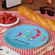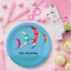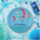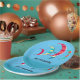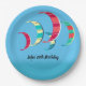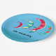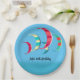 Summery blue kite surfing theme paper plates with customisable text. Brightly colored kites in reds, blues, yellows and green adorn the plates.