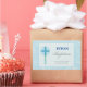Perfect Baptism gift, souvenir, giveaway or party essentials to congratulate a little boy as he is Baptized. Lace look on the front is overlaid on light blue and sends blessings to him. A cross shows the Christian or Catholic nature of the special religious event.