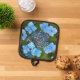 Safely handle baking trays, cookie sheets and muffin tins from the oven with this pot holder and oven mitt with black trim that features the photo image of a blue Lacecap Hydrangea bloom. A lovely, floral design! Select your pot holder backing style.