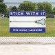 Creative lacrosse team banner featuring motivational line and lacrosse stick design on a blue background. Edit text customize.