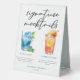 This cool pool party or beach wedding signature mocktails table tent sign features simple script above 2 drawings of drinks and their ingredients for your tropical island celebration. A cute non-alcoholic Blue Lagoon and Summer Sunrise drink for a refreshing poolside or ocean reception in the summer. Complete with the couple's names and date.