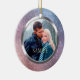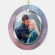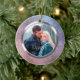 On this pretty First Christmas ornament, your own photograph takes center stage inside a shiny silver frame, which is placed on a gradient blue violet sparkling lights background. The back of the ornament has the same background and silver frame, with your custom text in two fields in darker pink violet. Make it say whatever you'd like!