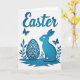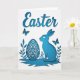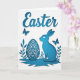 This card features a layered silhouette scene in a single rich blue against a white background, giving it a calm, romantic feel as the shapes seem to lean toward one another like quiet companions. Near the top, the word “Easter” stretches across in flowing blue lettering, with a soft shadow that adds depth. Below, a long-eared bunny stands on the right, angled slightly left as if gazing fondly toward the details beside it 🐰. On the left sits a tall decorative egg filled with delicate cutout patterns that reveal white space like lace. Small leaf sprigs and two tiny winged insects float around the main shapes, adding gentle motion and a sense of shared springtime warmth 🌷. A wavy blue ground line runs along the bottom, anchoring the scene and echoing the curves in the lettering. Soft lighting creates faint shadows behind the bunny, egg, leaves, and insects, making the blue cut-paper shapes stand out crisply on the white field.