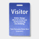 Vertical Visitor's Pass badge in blue leather gradient design. All elements are changable or removable. Elements include: Visitor (can say "guest" or "pass" or any word, the phrase "Visitor Badge Must Be Returned Before Exiting the Building, company name, company department, Security barcode scan is on the back and can be changed or removed. Slot at top for lanyard, but you can choose another option, such as a metal clip or retractable strap.