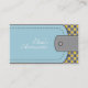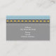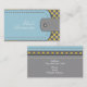 Blue and grey leather look and pattern yellow modern accessories business card template featuring a light blue and a grey band with seams and a button in leather style-not real leather just a PRINTED image and geometric pattern in grey and yellow.