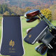 Personalized golf putter head cover. Your initials are lettered in modern oversized typography and you can also add either your name or your golf club's name. The design is printed with a leather textured look background in blue.