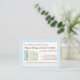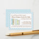 A charming poem requests that guests bring a book for the baby-to-be to start the new mom off with a library of beloved children's books. Just insert this sweet card inside the baby shower envelope. The adorable baby blue, yellow and mint color scheme with a cute little row of matching books makes a perfect design to coordinate with just about any baby shower invitation for a boy.