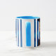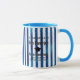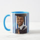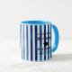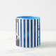 Personalized men's portrait mug for a graduation with a blue lines pattern on the background and the class, the graduate's name, degree, university name, and a grad cap design on the back. To create a cut-out, crop your image to the desired subject and use the "remove background" tool.