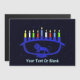 A blue, lion-themed Chanukkah menorah with lit candles superimposed on a starry background. Add your own text.