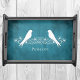 Create a unique gift for friends or family with a Blue Lovebirds Floral Vine Personalized Serving Tray. Serving Tray design features a blue grunge background adorned with a floral vine and a pair of resting birds. Personalize with your own name or create a unique gift for friends or family. Additional items available with this design as well. Please contact me directly for assistance with personalization.