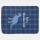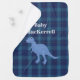 Stylish blue classic clan MacKerrell tartan plaid baby blanket, with a cute cartoon blue dinosaur, in the middle. White custom text is ready to personalize to read what you want.