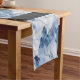 A table runner in dark blue, white and light blue marble liquid ink colors. The design is a dreamy romantic and elegant design with gold and silver traces like the coastal sea breeze shimmers. It looks like an abstract marmor stone texture and fluid lava at the same time interrupted by dusty blue stripes. This design fits perfect in coastal homes and makes the breeze come into your room.