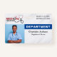 Professional medical ID badge in blue and white, featuring employee photo, name, title, department, issue/expiration dates, and barcode. Ideal for hospital staff, nurses, doctors, or clinic employees. Customizable with your logo and return instructions. A polished, secure solution for healthcare identification.