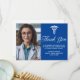 A classic custom photograph medical school graduation thank you card in classic blue and white for a college or university from the class of 2024. Customize with your school name and graduating class under the caduceus and calligraphy for an elegant personalized graduate photo card of thanks with your senior portrait.