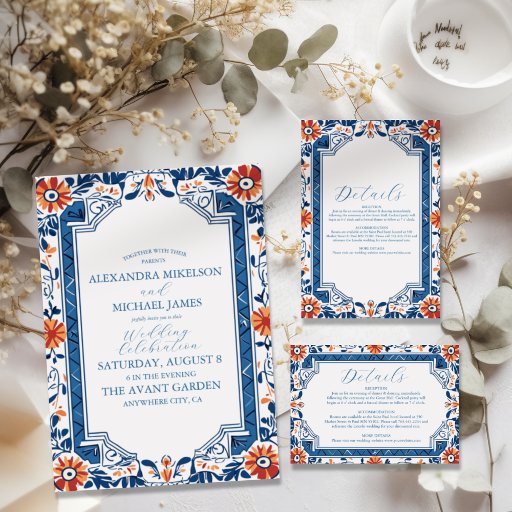 Blue Mediterranean Italian Tile & Lemon Wedding Invitation