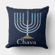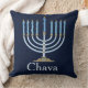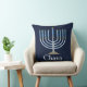 Light Blue Menorah Toss Pillow set on a dark navy blue background. Easy to personalize with your name or message. Great Hanukkah gift!
