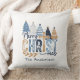 Christian Merry Christmas Throw Pillow with a typography design and modern blue Christmas trees, cross and custom family name. Easily personalize the name - Kate Eden Art