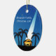 Blue Modern Nativity Christmas Ornament personalized with your name or headline. Features blue and black night sky with spotlight shining down on the manger scene with baby Jesus, palm trees and stars in the sky.. Great christian religious ornament.