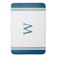 Blue Monogram Bath Mat. If you're looking for a modern, monogrammed bath mat that exudes class and sophistication, then you'll love our elegant blue (deep peacock blue) and white border mat. Featuring a classic and stylish triple border with a monogram, this eye-catching design will look great in any bathroom.