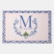 This Christmas design has a preppy grandmillennial design featuring a navy blue damask crest on a blush pink background. There is a place to add your monogram initial and name.