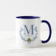 This Christmas design has a preppy grandmillennial design featuring a navy blue damask crest on a blush pink background. There is a place to add your monogram initial and name.