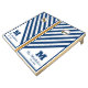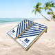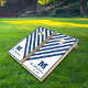 Navy Blue Monogrammed Cornhole Set. A perfect addition to your summer lawn games. This modern cornhole set is adorned with blue and white stripes, making it great for a beach or lakehouse.