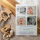 Minimalist photo invitation for a naming ceremony with room for four of your photos in a simple collage. The back features a cute pattern of baby footprints in white and aqua green.