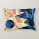 Accent pillow with bold complementary colors and interesting shapes and textures; an abstract artwork depicting a blue moon and mountains against a fiery orange sky.