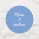 Wedding confetti with a blue floral theme to match our "Blue Moon" design line. Fun pack of 60 pieces of paper confetti in three sizes (read more about this product below). The largest pieces have a photo template. Upload a picture of the couple and it will print on both sides of all the largest pieces in the set. Names of the bride and groom are printed in white over blue on the medium size confetti, and the smallest contain a blue hydrangea flower image. Scatter on tables at a wedding shower, rehearsal dinner, or reception.