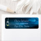 A dark blue night with a full moon and dramatic dark clouds. Decorated with a painted mason jar with a shining candle. Template for name and address, light blue colored letters.