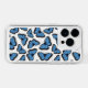 Seamless pattern design with blue morpho butterflies on hydrangea flowers linework background.