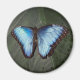 Blue Morpho butterfly resting on a leaf photographic magnet. Available in square and round sizes