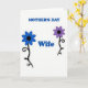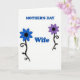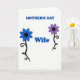 This greeting card features a simple white background with a romantic, close-to-home focus on a partner and mother ❤️. At the top center, the words “MOTHER’S DAY” appear in rounded blue lettering, setting the occasion right away. Just beneath it, also centered and in the same blue, the word “Wife” adds a tender, intimate touch without needing extra decoration. On either side of the text sit two stylized flowers, like a quiet pair standing together the way two people might lean in side by side. The left flower has six blue petals around a dark center, while the right flower mirrors it with soft purple petals for gentle contrast 🌼. Both blooms are held by thin black stems that curve downward into small spirals with a few leaf-like marks near the base. The two flowers flank the centered blue text, with black stems curling into decorative loops near the lower area of the design.