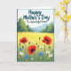 This greeting card shows a sunlit meadow stretching across the front, with a few large red flowers opening wide like a shared secret between close friends ❤️. Their petals are deep crimson, and the centers are dark blue to near-black, giving them a dramatic, affectionate pull against the golden-yellow grass. Scattered around them are smaller white and pale sky-blue blooms with slim green buds, adding gentle variety like quiet little compliments. A thick row of deep green trees sits in the middle distance, forming a calm boundary that makes the foreground feel cozy and close. Farther back, soft rolling mountains fade in cool blues and light lavender, creating a peaceful backdrop under a bright sky with scattered clouds. Near the top, a flowing message is placed prominently in dark teal, standing out against the light background and a subtle textured border, like a tender note meant to be noticed 🌼. The scene is framed by warm, sun-kissed tones, with the red blossoms standing tallest in the foreground against the golden field.