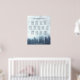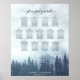 This 13 table wedding seating chart features a rustic design with a foggy or misty mountainside covered in blue pine trees. The title reads "please find your table" in elegant lacy script calligraphy. There is space for the names of the couple and wedding date. This chart has table assignments for 130 guests - 10 people per table. Perfect for an outdoor or mountain destination wedding.