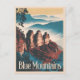 A captivating and nostalgic depiction of the Blue Mountains, a stunning region located just outside Sydney, Australia, known for its breathtaking vistas, dense eucalyptus forests, and dramatic cliffs. The design captures iconic landmarks like the Three Sisters rock formation and the lush valleys that characterize this beautiful area. Rendered in a vintage style, the artwork evokes a sense of tranquility and adventure, inviting viewers to explore the serene landscapes, hiking trails, and the rich flora and fauna that make the Blue Mountains a unique natural wonder.