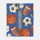 An action-packed fleece blanket featuring a hand-drawn pattern of footballs, basketballs, soccer balls, baseballs, and hockey pucks with a custom name displayed on a bold gray banner. The bright royal blue background delivers vibrant athletic energy. A standout gift for young athletes, sports fans, or the multi-sport competitor who does it all. The name text is fully customizable.
