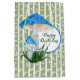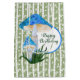 Pretty watercolor illustration of blue mushrooms on green and white aspen trees background with customizable Happy Birthday text.