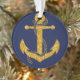 Nautical Christmas ornament with golden anchor on navy blue background. It's double-sided circle ceramic ornament - it measures 2.87 inches and weights 1.4 ounces.