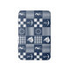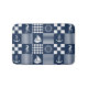 Navy Blue patchwork pattern bathroom mat featuring geometric checks and stripes as well as seahorses, sailing boats, anchors, and ships’ wheels.